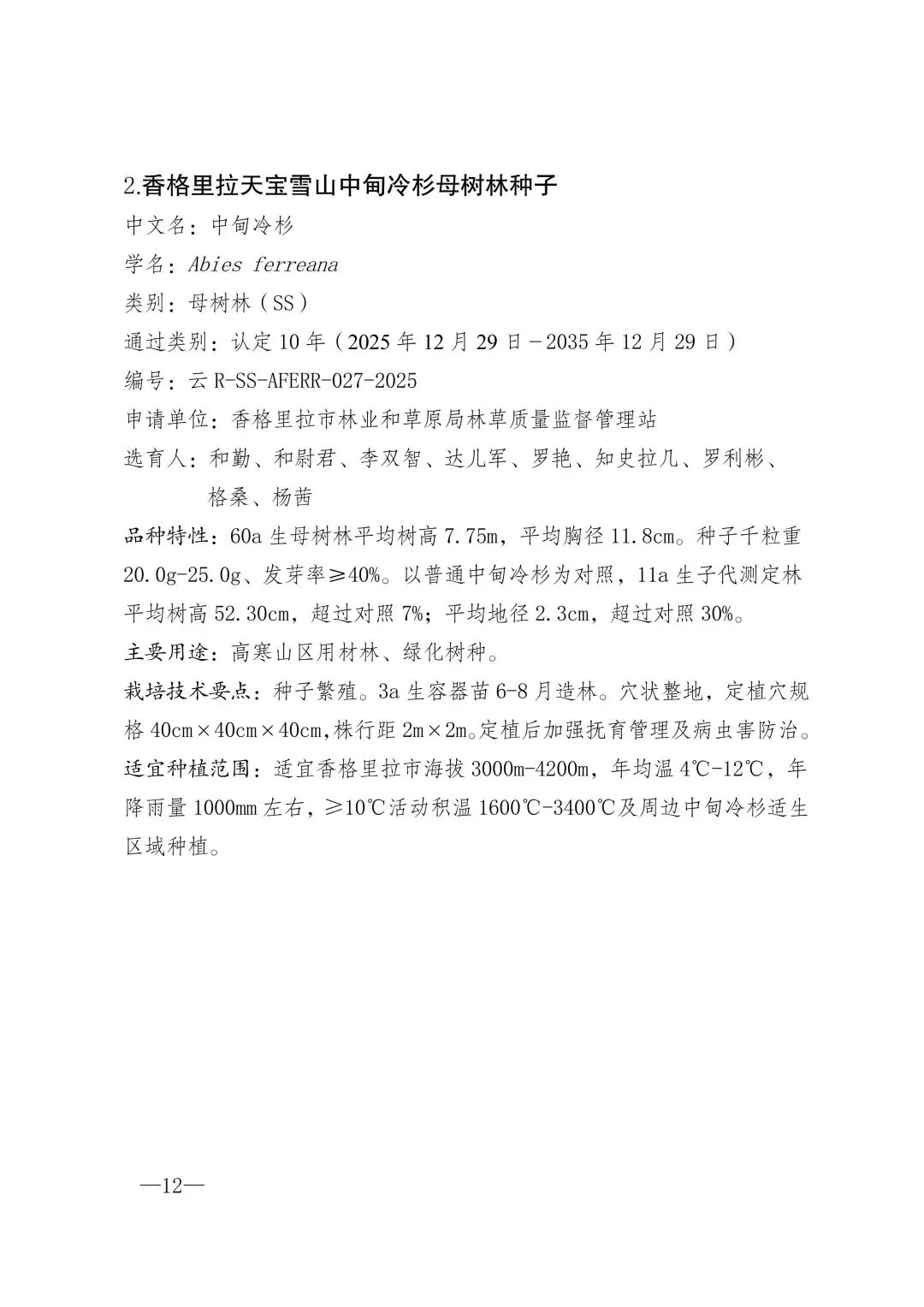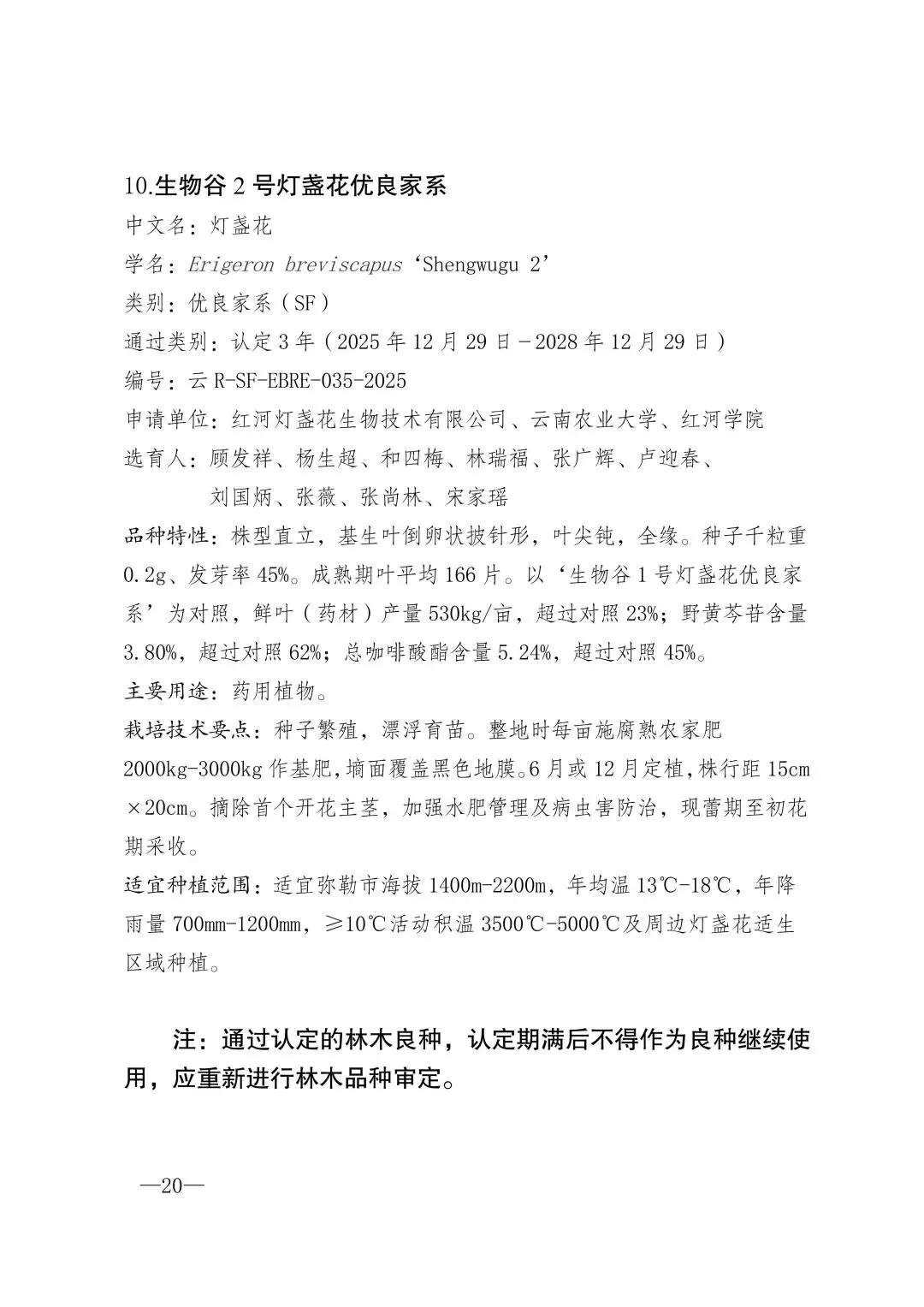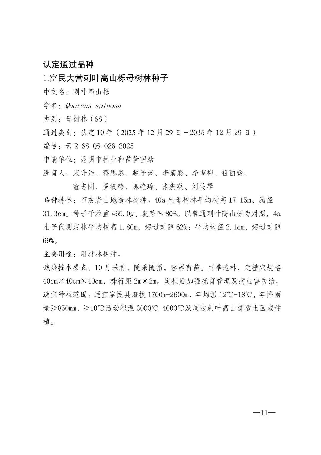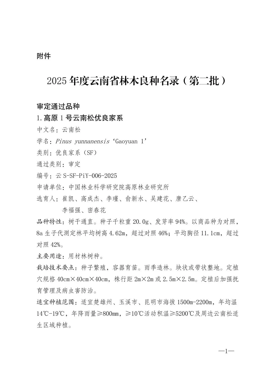 根据《中华人民共和国种子法》、《云南省林木种子条例》有关规定,现将云南省林木品种审定委员会审定作为良种的高原1号云南松优良家系等10个品种、认定通过的富民大营刺叶高山栎母树林种子等10个品种(详见附件)予以公布。自发布之日起,以上品种可在本通知规定的适宜种植范围内推广。
