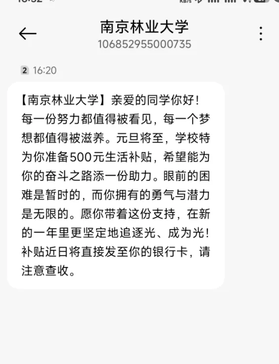 本着“精准识别、保护隐私”的原则,学校将系统中筛查出的特殊困难学生群体,如孤儿(含事实孤儿)和本年度家庭突发严重困难的学生列入重点支持的发展型资助对象。新年将至,学校多部门协作,悄悄为这部分受助学生发放500元/人的生活补贴,并发去暖心祝福短信。这份暖心资助将学校的深切关怀转化成了实实在在的支持与温暖,传递出“南林大家庭”的浓浓情意。