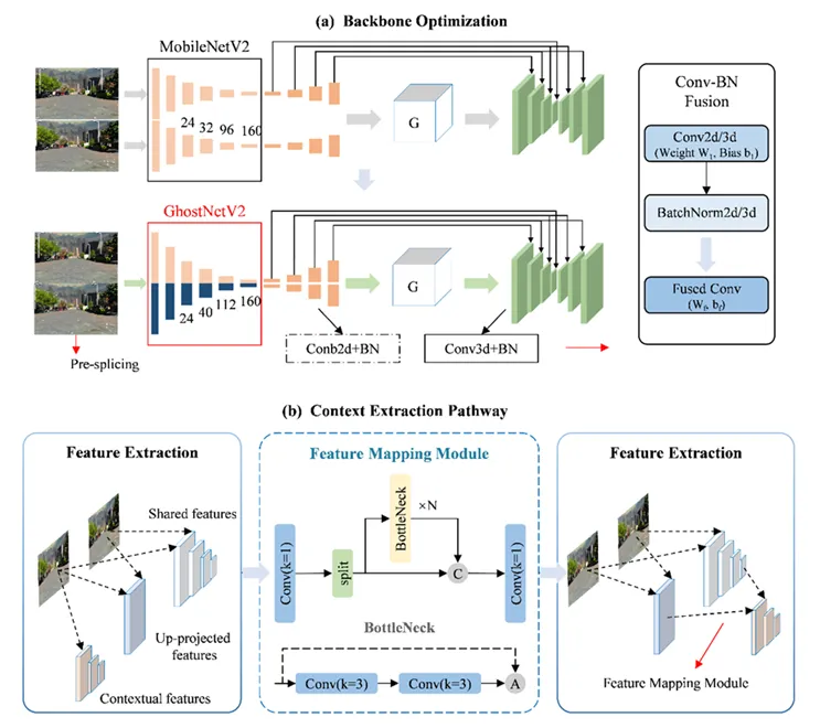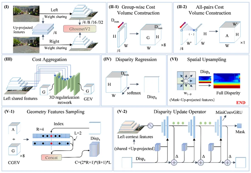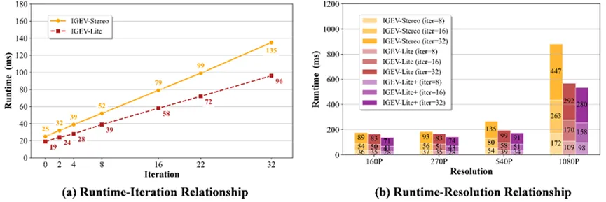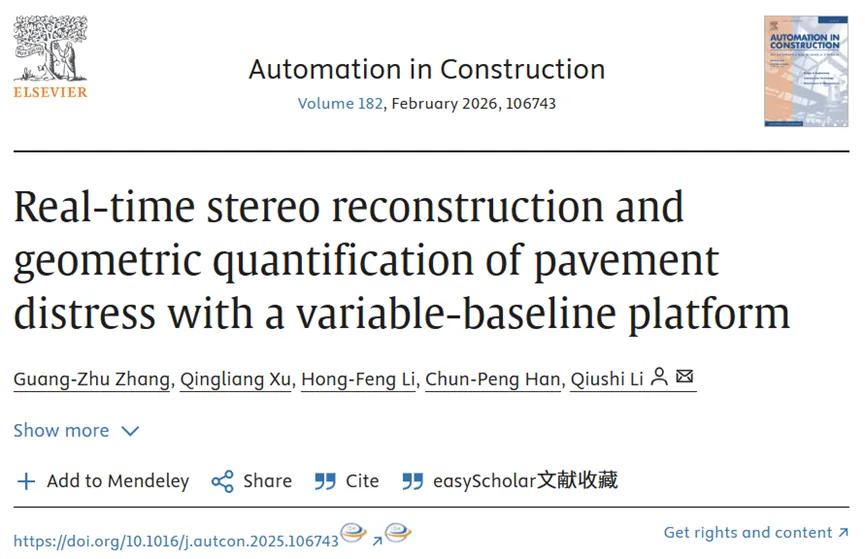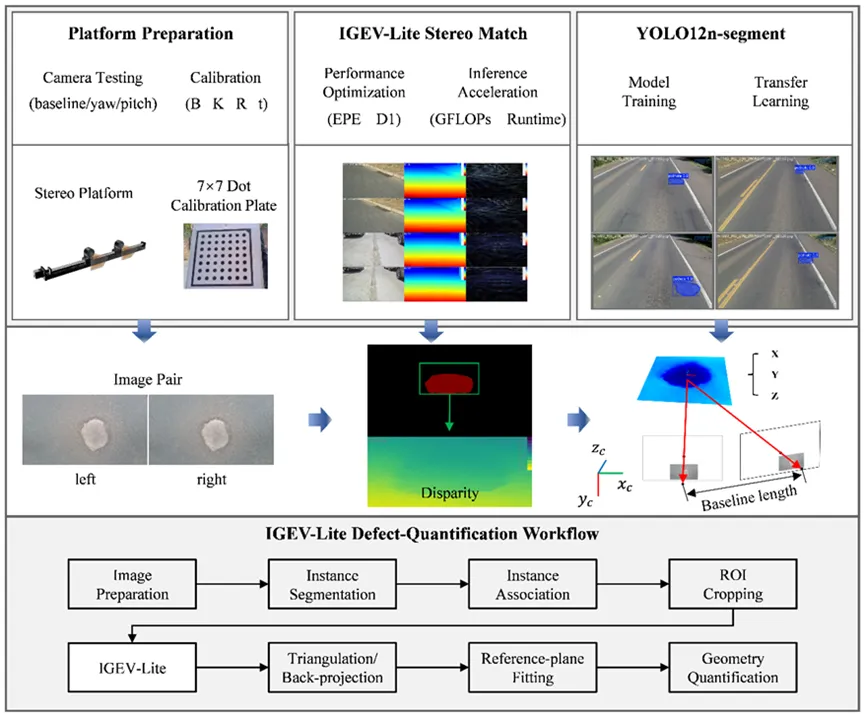 本研究提出并验证了一种融合轻量化立体匹配网络、可变基线双目采集平台与平面参考几何量化方法的道路病害三维感知方案。在统一评测协议下,IGEV-Lite 相较 IGEV-Stereo 将端点误差(EPE)由0.608px 降至0.584px,视差离群率D1由3.24%降至2.97%,同时参数量减少约 25%,计算量(GFLOPs)降低约 44%。在工程部署配置下,单帧推理延迟由135ms 降至97ms,经部署级加速后可进一步降低至88ms。在基线长度B=240mm条件下,病害几何量化实验中最大深度的平均相对误差约为2.7%,积分体积的平均相对误差约为0.9%。真实道路在线测试表明,系统端到端处理延迟稳定在36–42ms范围内,能够在实际巡检场景中实现路面病害的实时三维重建与几何量化。