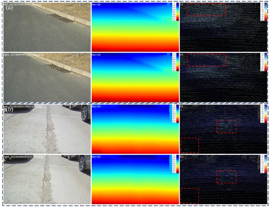 图8 IGEV-Stereo 与 IGEV-Lite 在不同路面类型上的视差结果对比图