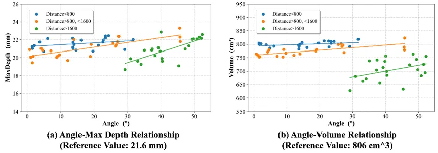 图11 不同拍摄距离条件下最大深度与体积的量化结果