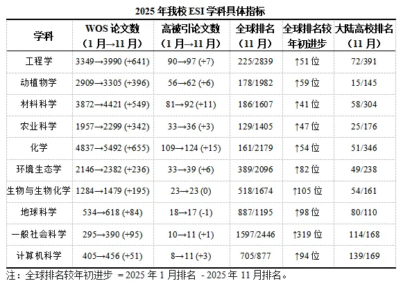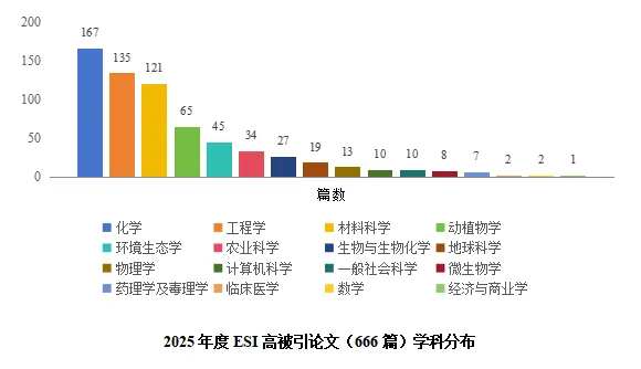 三、国际竞争力:工程学与化学全球领先,多学科实现反超。相对全球平均影响力指标中,工程学以1.14-1.21的数值稳居第一,化学在5月后从1.05跃升至1.2以上,两者全年保持对全球平均水平的领先;一般社会科学、生物与生物化学、动植物学在5月后实现关键突破,从低于全球平均(0.84-0.89)反超至1.12-1.16,展现出强劲的追赶势头;地球科学、材料科学、农业科学虽未完全领先,但5月后逐步接近全球平均(0.97-1.0),其中地球科学9月达到1.0,与全球水平持平;环境生态学虽持续提升(0.83-0.94),但仍需进一步加强。