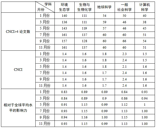 整体来看,化学、工程学等传统优势学科在高产出与国际竞争力上表现突出,社会科学与地球科学凭借高CNCI值彰显质量优势,而计算机、动植物学等学科则呈现快速增长态势。5月后多数学科的相对全球影响力显著提升,反映出研究质量与国际认可度的整体进步。