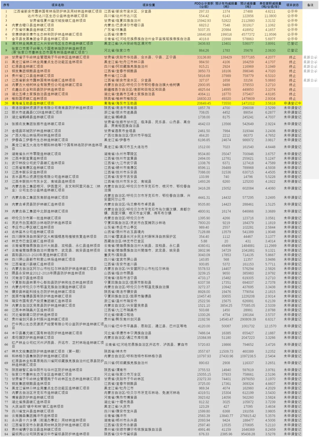 在84个造林项目中,有5个项目属于之前被终止、现重新进入公示的情况。