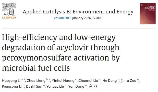 Haoyong Li, Zhao Liang, Yinhui Huang, Chuanqi Liu, He Dong, Jinru Zou, Pengsong Li, Dezhi Sun, Yongze Liu, Yan Dang, High-efficiency and low-energy degradation of acyclovir through peroxymonosulfate activation by microbial fuel cells, Applied Catalysis B: Environment and Energy, 2026, https://doi.org/10.1016/j.apcatb.2025.125808