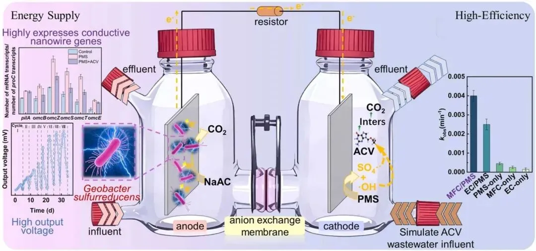 在本研究中,我们基于高电活性微生物硫还原芽孢杆菌(G. sulfurreducens)开发了一种用于降解乙酸的微燃料电池驱动型PMS活化系统。该系统采用石墨板作为电极,阳极接种成功形成以硫还原芽孢杆菌为主导的高电活性生物膜,阴极腔室则注入含乙酸的合成废水。通过系统评估关键操作参数(包括初始pH值、PMS用量、ACV浓度及共存阴离子的影响),全面研究了该MFC/PMS混合系统的ACV去除效率。通过代谢组测序与转录组分析,解析了微生物群落结构,并鉴定出编码阳极直接胞外电子传递相关蛋白的关键基因。利用液相色谱-质谱联用技术(LC-MS)识别中间产物,阐明了降解机制并提出潜在降解途径。此外,通过综合分析与生物测定方法,预测了降解过程中矿化效率与生物毒性演变的动态变化。综上,该生物电化学-高级氧化工艺(AOP)混合技术不仅为高效去除阿司匹林等难降解药物提供了新策略,更对开发可持续、能量中性的水处理范式具有重要启示意义。