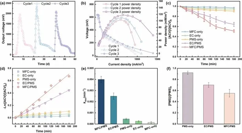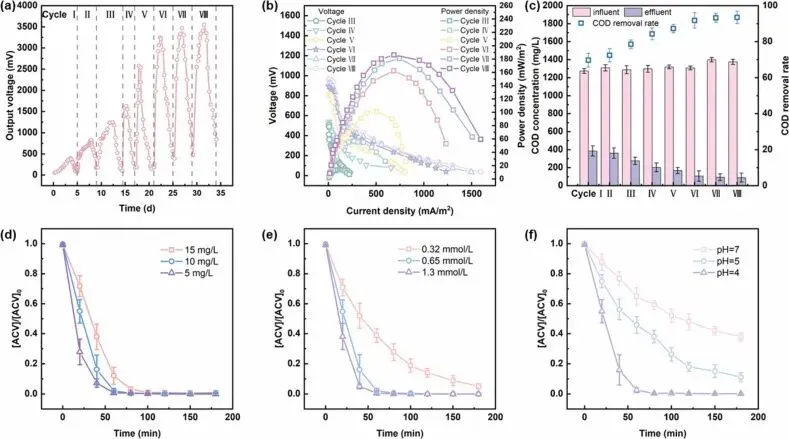 Fig. 3. Performance of the mixed-culture MFC/PMS system. (a) Output voltage across cycles during reactor startup. (b) Power density and polarization curves during system activation. (c) COD variation in anolyte during MFC operation. (d) ACV degradation efficiency under varying initial concentrations, (e) PMS dosages, and (f) pH conditions.