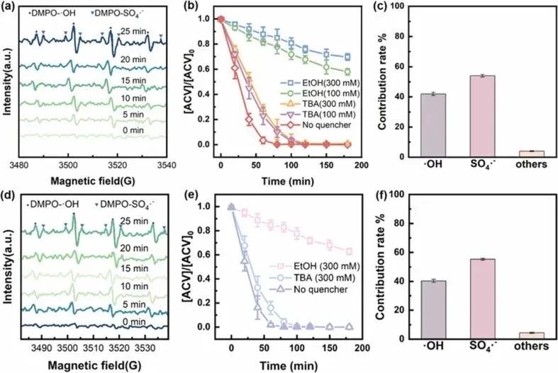 Fig. 4. Pure-culture MFC/PMS system (a) EPR spectra, (b) ACV degradation efficiency with quenchers, (c) Radical contribution percentages. Mixed-culture MFC/PMS system (d) EPR spectra, (e) ACV degradation efficiency with quenchers, (f) Radical contribution percentages.