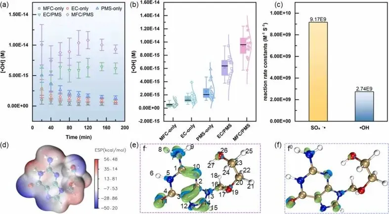 Fig. 5. (a) Time-varying hydroxyl radical concentration, (b) Statistics of hydroxyl radical concentration in different reaction systems, (c) Reaction rate constants for the reaction of SO4•- and •OH with ACV[71], (d) Surface electrostatic potential of ACV, (e) Isosurfaces of the Fukui (-) (Data are presented in Supplementary Table S6 and Table S7), (f) Isosurfaces of the Fukui (0) (Data are presented in Supplementary Table S6 and Table S7).综上所述,通过利用微生物燃料电池激活活性炭(PMS)降解丙酸(ACV),构建了一套经济高效且节能的系统,展现出显著的应用潜力。该微生物燃料电池/活性炭系统表现出卓越的性能与稳定性,在pH值4、活性炭剂量0.65–1.3 mmol/L、初始丙酸浓度5–15 mg/L的条件下,实现了近100%的丙酸去除率。PMS的电化学活化主要归因于MFC产生的周期性电流。通过EPR谱分析、淬灭实验及无机离子效应分析,证实了SO₄•⁻与•OH的共存,其中SO₄•⁻起主导作用。在MFC启动过程中,输出电压稳步上升,伴随发电量显著提升,最大功率密度达187.1 mW/m²。阳极生物膜中Geobacter相对丰度激增至27.4%,编码胞外电子传递相关蛋白的基因(pilA、omcB、omcZ、omcS、omcT、omcE)表达上调。这些结果凸显了MFC/PMS系统卓越的PMS活化与ACV降解效能,不仅彰显其实际应用价值,更为推进电化学反应器在有机污染物降解领域的应用提供了关键性启示。