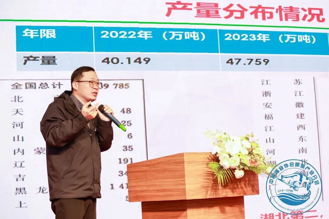 中国渔业协会鳜鱼产业分会会长刘立维随后作产业报告,深入剖析了行业发展现状与未来趋势。刘立维指出,鳜鱼已从传统名贵淡水鱼发展成为产业转型升级与绿色发展的首选品种。2024年全国鳜鱼产量已达50万吨,产值超200亿元,全产业链规模约700亿元,其中长江流域产量占全国总量的67%,产业集聚效应明显。
