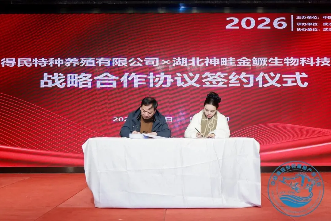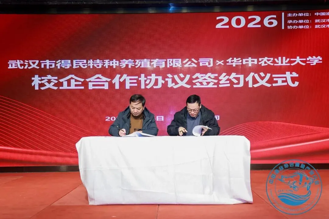 本次会议上,得民水产与华中农业大学正式签署校企合作协议。双方将重点围绕鳜鱼工厂化繁育与饲料驯化养殖展开合作,协议由得民水产董事长徐德忠与华中农业大学水产学院副教授刘立维共同签署。
