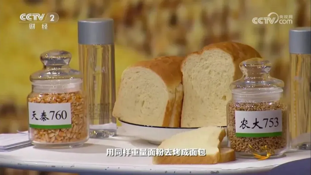 现场,孙其信带来两瓶由中国农业大学选育的种子,分别是农大753(小麦)和天泰760(玉米)。“农大753的面包加工品质可以替代进口优质面包粉。用同样重量的面粉烤成面包,谁的体积大是面包优不优质的标志之一,农大753烤出的面包体积比中等优质小麦面包要高出20%。目前,在皖北2025年的收获面积达到了50万亩。”