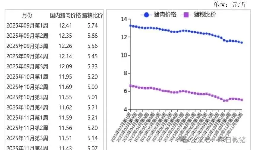 1.1%,同比减 2.1%。11 月份猪肉集贸市场价每公斤 23.05 元,环比跌 1.5%,同比跌 19.7%;生猪集贸市场价每公斤 12.55 元,环比跌 0.2%,同比跌 27.6%;仔猪集贸市场价每公斤 24.25 元,环比跌 6.0%,同比跌 29.5%。
