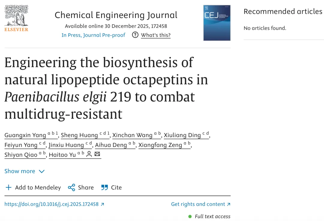 近日,中国农业大学动物科学技术学院谯仕彦院士团队的于海涛副教授在化学工程领域顶级期刊《Chemical Engineering Journal》上发表了一项重要研究成果,题为《Engineering the biosynthesis of natural lipopeptide octapeptins in Paenibacillus elgii 219 to combat multidrug-resistant》。这项工作不仅成功挖掘出一种具有广阔应用前景的新型抗菌脂肽资源,更构建了一套适用于非模式微生物的高效生物制造技术体系,为应对全球日益严峻的抗生素耐药性危机提供了新思路和可行路径。