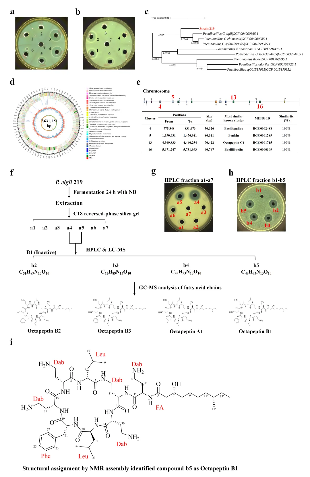 面对多重耐药菌感染威胁不断加剧的现实,开发机制新颖、稳定性高且安全性良好的新型抗菌药物已成为当务之急。八肽菌素(Octapeptins)作为一类天然环状阳离子脂肽,因其广谱抗菌活性、低耐药诱导性以及良好的生物相容性,被视为极具潜力的候选药物。然而,其天然产量极低、分离纯化过程复杂,严重制约了其进一步开发与实际应用。针对这一瓶颈,研究团队从土壤样本出发,利用靶向抗菌活性的高通量筛选技术,成功分离并鉴定出一株能高效产生八肽菌素的非模式菌株——Paenibacillus elgii 219。该菌株对大肠杆菌及耐甲氧西林金黄色葡萄球菌均表现出显著抑制作用。