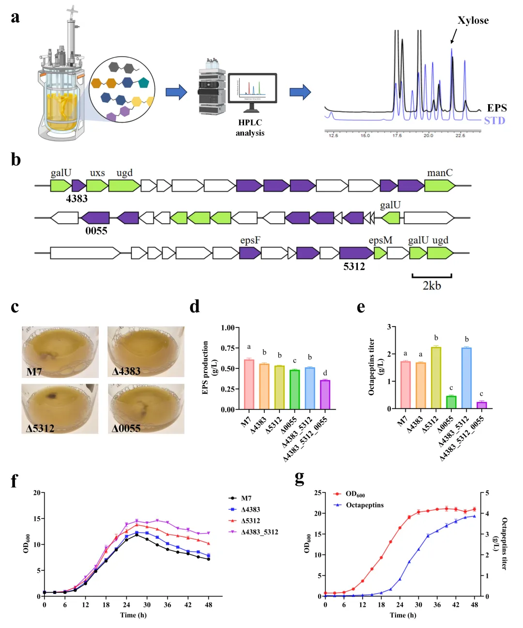 在此基础上,研究团队依托前期建立的基于II型内含子(Targetron)的基因编辑系统——该系统通过电穿孔介导外源DNA转化,已在 Paenibacillus elgii 219 中验证有效(相关成果已于2025年发表于 Applied and Environmental Microbiology)——精准敲除了胞外多糖合成关键糖基转移酶基因,有效降低了发酵液黏度,使产量进一步提升至2.3 g/L。最终,在5升发酵罐中实施补料分批培养策略,八肽菌素产量达到3.94 g/L,创下目前文献报道的最高滴度,实现了从毫克级到克级的跨越式突破。