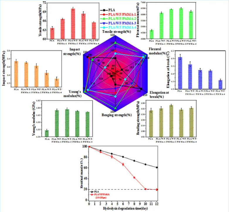 在本工作中,采用PLA为基体制备得到聚乳酸/木面粉/聚甲基丙烯酸甲酯(PLA/WF/PMMA)复合材料,采用不同粒径的WF进行填充改性,结果显示,150um<颗粒尺寸<180um的WF实现了PLA/WF/PMMA机械性能的最佳提升。 拉伸强度、弯曲模量和杨氏模量分别相较于纯PLA提升了10.02%、37.21%和32.80%。此外,PMMA与WF合作极大加速了PLA的水解过程,最终取得了良好表现。同时提升机械性能并加速降解对扩大PLA应用具有重大意义。