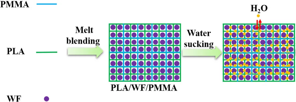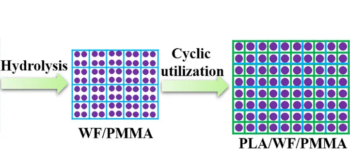 如图所示,PLA/WF/PMMA复合材料的制备与水解示意图。