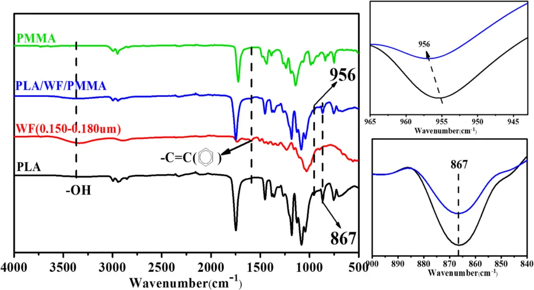 如图所示,956cm-1处非结晶区偏移,867cm-1结晶区链松散,表明PMMA和WF的加入导致PLA分子链松散积累。