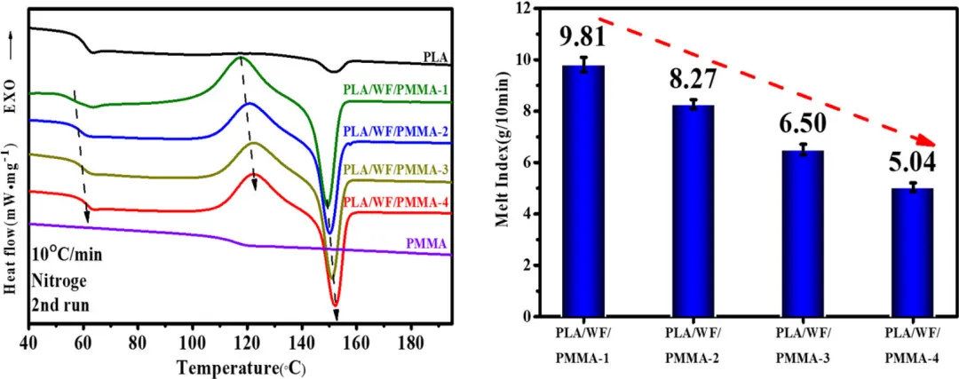 如中所示,随着PLA/WF/PMMA 的颗粒尺寸增加,Tg, Tc以及Tm逐渐上升,但WF颗粒较大且粗且多空隙结构阻碍了PLA分子链在成型过程中的运动。