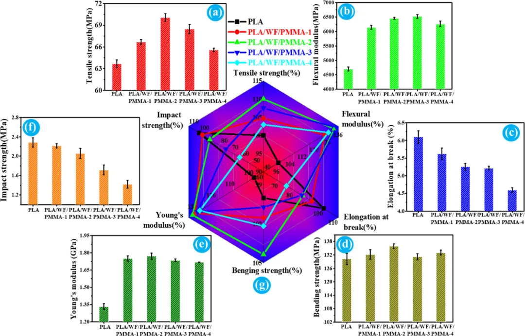 图a-f所示,PLA/WF/PMMA-2的机械性能尤为出色。其中,拉伸强度、弯曲模量、弯曲强度和杨氏模量分别提升了10.02%、37.21%、4.34%和32.80%。表明PLA和WF极性差异很大,因此混合工艺中两者的兼容性较差。