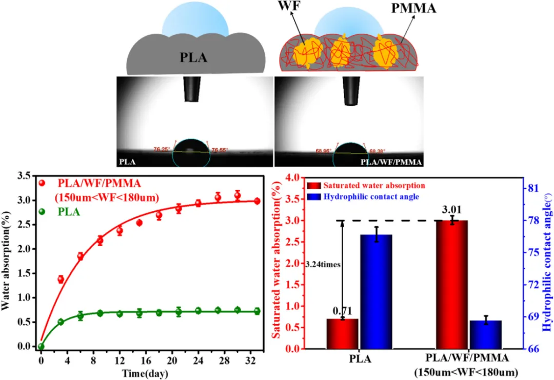 如图所示,PLA/WF/PMMA相对于纯PLA具有强烈的亲水性质,WF与聚合物之间的界面间隙提高复合材料的亲水性能。