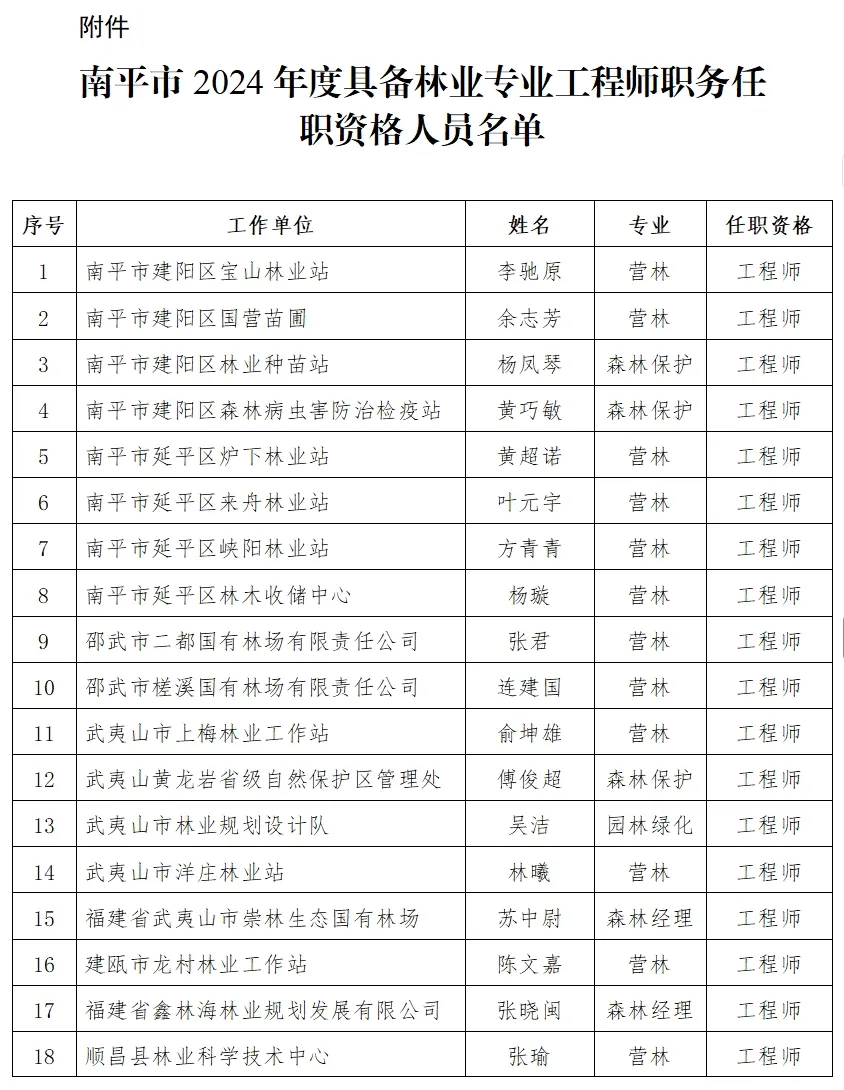 《关于请求确认李驰原等同志林业专业工程师职务任职资格的报告》(南林职改〔2025〕5号)悉。由南平市第二十七届工程系列林业专业中级职务评审委员会评审通过,李驰原等35位同志具备林业专业工程师职务任职资格(名单附后)。经研究,同意批准确认,任职确认时间为2025年9月27日。请予公布。