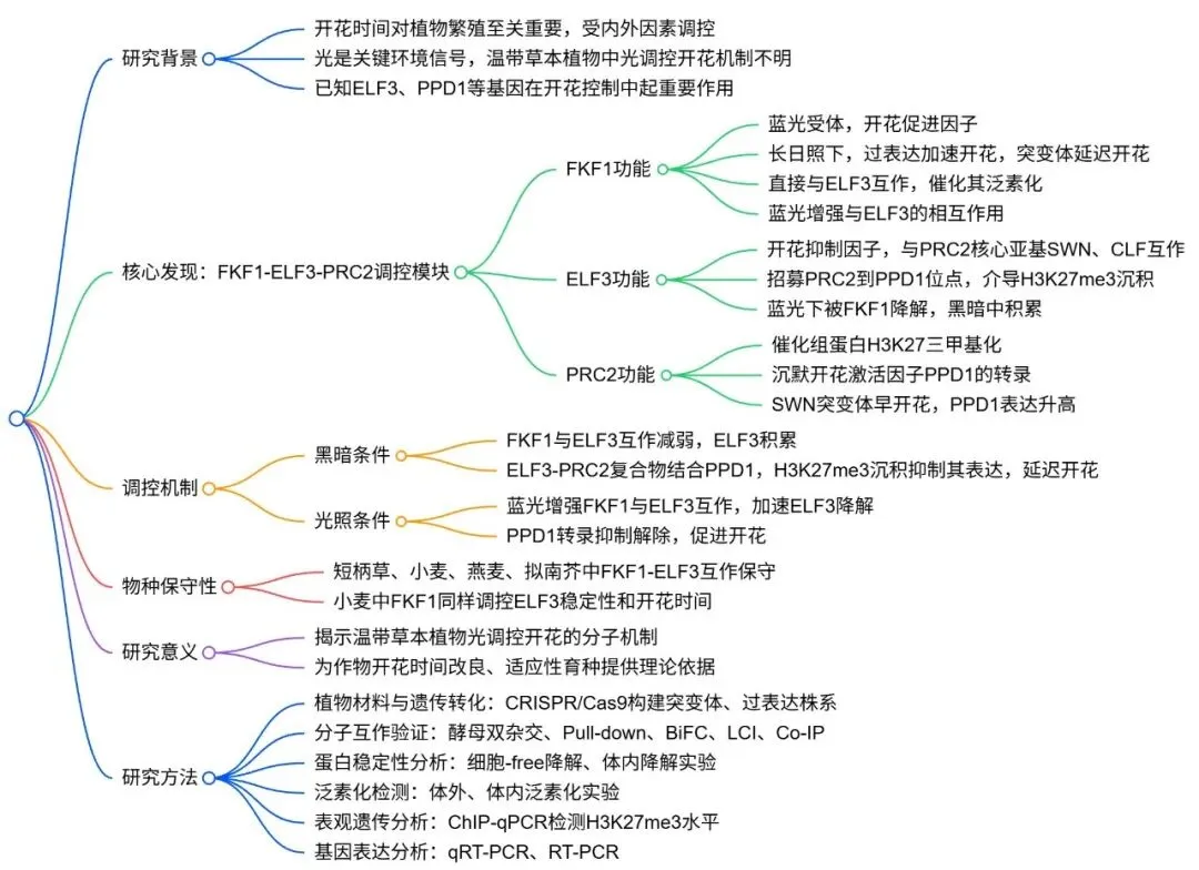 建立了开花调控与表观遗传的直接联系: 本研究创新性地将光周期调控途径与表观遗传抑制机制直接联系起来。研究发现,开花抑制因子ELF3扮演了“桥梁”的角色,它能够直接与表观遗传抑制复合物PRC2的核心催化亚基(SWN和CLF)相互作用,并将其特异性地招募至关键开花基因PPD1的启动子区域。