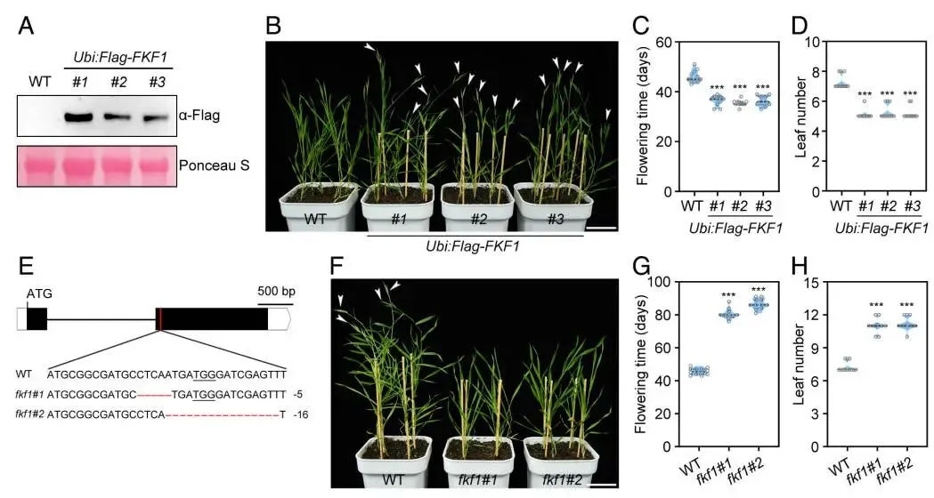 为了探究FKF1在二穗短柄草中的生物学功能,首先构建了FKF1的过表达转基因株系。在长日照条件下,这些过表达株系的开花时间显著早于野生型对照。对开花调控网络中的关键基因进行检测后发现,光周期途径基因PPD1及其下游的成花素基因FT1在FKF1过表达株系中均表现出转录水平的显著上调。与之相反,通过CRISPR/Cas9技术获得的fkf1功能缺失突变体则表现出显著的晚花表型,且其体内的PPD1和FT1基因转录水平受到明显抑制。这些结果共同表明,FKF1作为开花的正向调控因子,通过激活PPD1和FT1的表达来促进二穗短柄草的开花进程 (Fig. 1)。