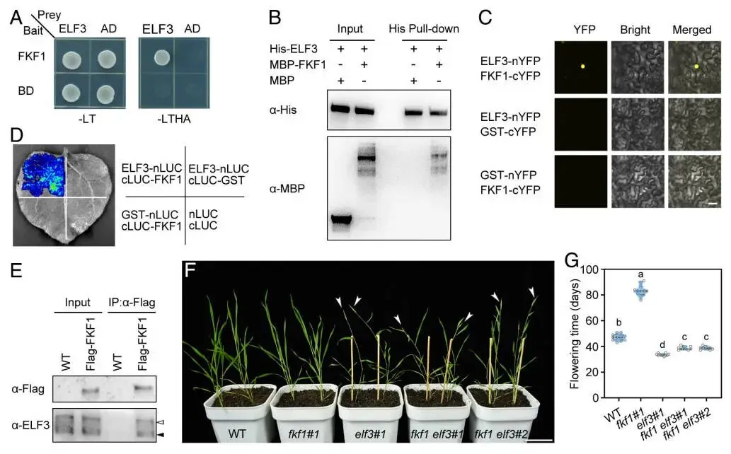 为了揭示FKF1调控开花的分子机制,采用酵母双杂交(Y2H)文库筛选的方法来鉴定其互作蛋白。结果表明,FKF1能够与开花抑制因子ELF3发生相互作用。这一互作关系通过靶向Y2H实验得到了进一步确认。随后,通过在烟草叶片中进行的分裂荧光素酶(Split-LUC)互补实验,证明了FKF1与ELF3在植物活细胞内确实存在物理互作。为了在二穗短柄草自身系统中验证此结论,在二穗短柄草原生质体中进行了免疫共沉淀(Co-IP)实验。结果显示,当FKF1-FLAG与ELF3-HA共表达时,FKF1-FLAG能够被ELF3-HA特异性地沉淀下来,反之亦然。综合这些来自不同实验体系的证据,可以确定FKF1与ELF3在体内外均能发生直接的物理相互作用 (Fig. 2)。