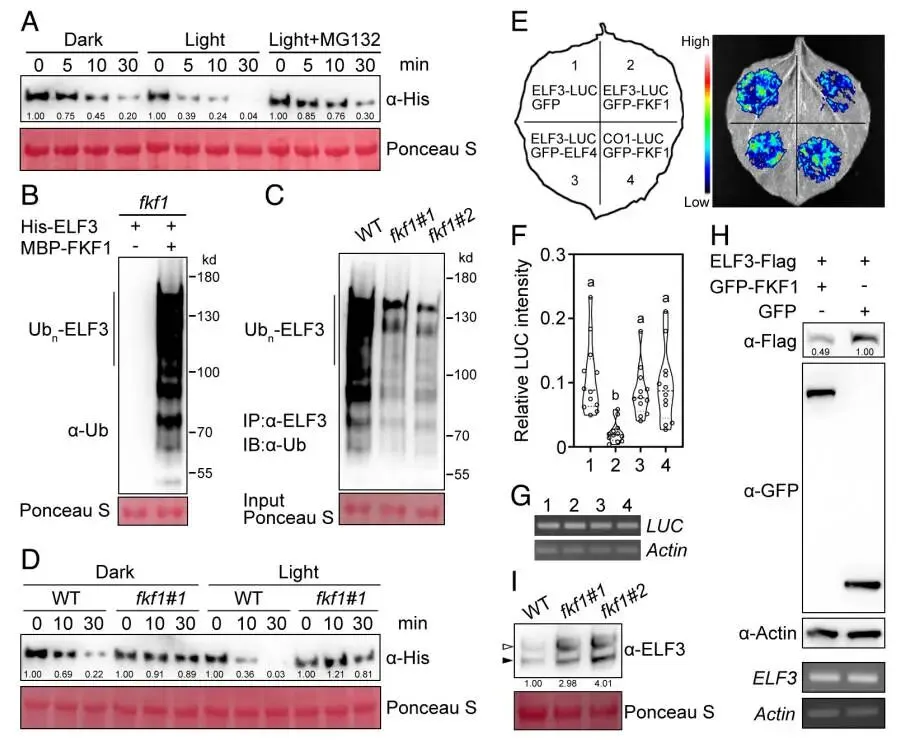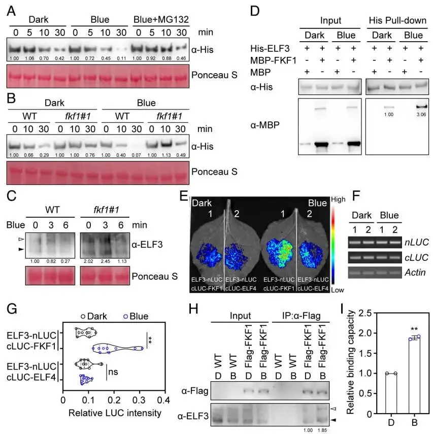 阐明了光依赖的核心分子机制: 研究的突出创新点在于明确了“光”这一环境信号如何被整合进蛋白调控网络。研究证实,蓝光能够显著增强FKF1与ELF3之间的物理相互作用,并加速由FKF1介导的ELF3蛋白降解过程。这为理解植物如何精确感知光周期变化,并将其转化为蛋白稳定性的改变,最终控制开花时间提供了直接的分子机制证据。