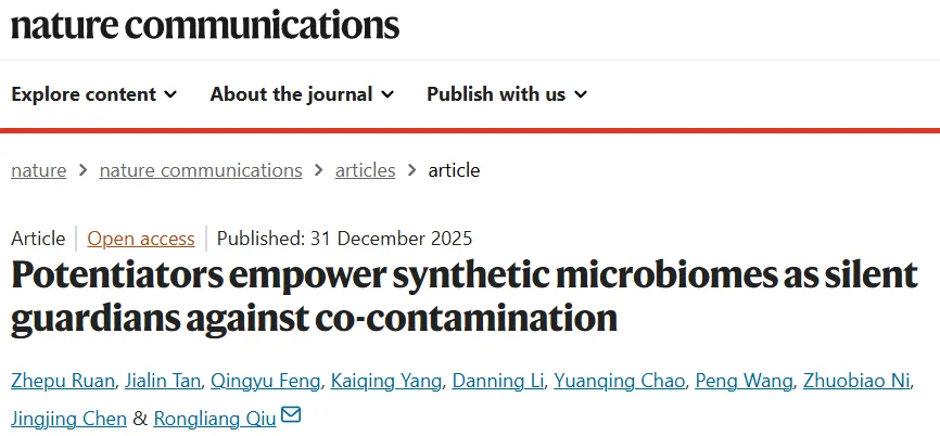 2025年12月31日,华南农业大学资源环境学院仇荣亮教授团队在Nature杂志子刊Nature Communications(中科院1区,5年影响因子17.2)在线发表题为“Potentiators empower synthetic microbiomes as silent guardians against co-contamination”的研究论文。该研究围绕复杂有机污染情景下合成微生物组的理性构建与功能强化,提出了一种全新的菌群设计范式,为高效、稳定的环境生物修复提供了重要理论依据与技术支撑。