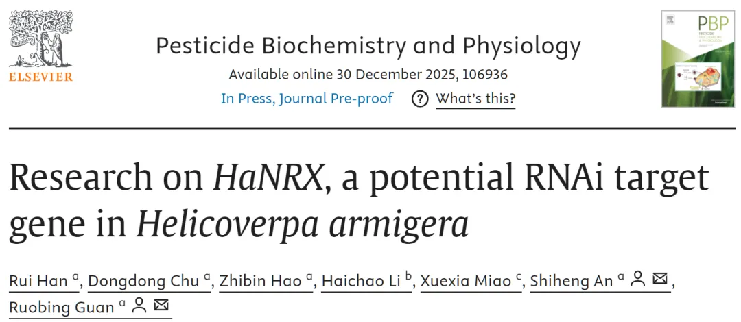 近期,河南农业大学植物保护学院安世恒教授团队在《Pesticide Biochemistry and Physiology》发表了题为“Research on HaNRX, a potential RNAi target gene in Helicoverpa armigera”的研究论文。该研究揭示棉铃虫中HaNRX基因可作为RNA生物农药防治棉铃虫的高效潜在靶标,并系统评估了植物介导RNAi技术在害虫绿色可持续防控中的可行性与应用潜力。研究成果为棉铃虫绿色综合防控策略提供了新的理论与技术依据。