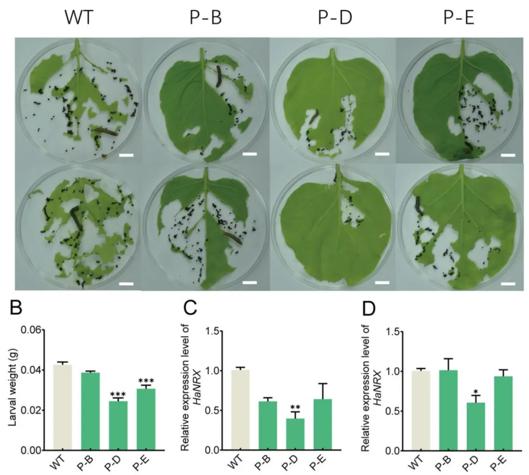 本研究揭示,棉铃虫HaNRX基因在脑组织中表达水平最高,其次为腹神经节和表皮;在不同发育阶段中,蛹期的基因表达达到峰值,五龄幼虫期次之。跨物种比较显示,NRX氨基酸序列在不同昆虫间具有超过90%的一致性,且其dsRNA靶向区域在鳞翅目内呈现高度保守特征。通过dsHaNRX处理一龄棉铃虫幼虫,其存活率显著降低;幼虫体重在72小时与120小时后分别下降17.06%和19.69%。在四龄幼虫中注射dsHaNRX后,HaNRX基因表达量下调60.39%;96小时和144小时后幼虫体重分别减少32.54%和13.53%。此外,取食表达dsHaNRX的转基因烟草后,棉铃虫幼虫的叶 片取食量明显减少,体重增长受抑制,HaNRX基因表达水平下降,幼虫体长与蛹重均显著降低,但死亡率未出现显著变化。 该研究证实,NRX基因在鳞翅目昆虫中高度保守,针对该基因的dsRNA对棉铃虫和草地贪夜蛾均表现出良好防治效果,凸显其作为广谱RNAi靶标的潜力。同时,利用转基因烟草递送dsHaNRX成功抑制害虫生长,验证了植物介导RNAi在害虫防控中的可行性。展望未来,可通过提高转基因作物中dsRNA的表达效率、优化dsRNA分子结构以增强稳定性、设计多靶点dsRNA以降低抗性风险,或结合RNAi与低毒化学农药、Bt毒素等策略实现协同防控,从而进一步提升RNAi技术在农业害虫治理中的应用效能。