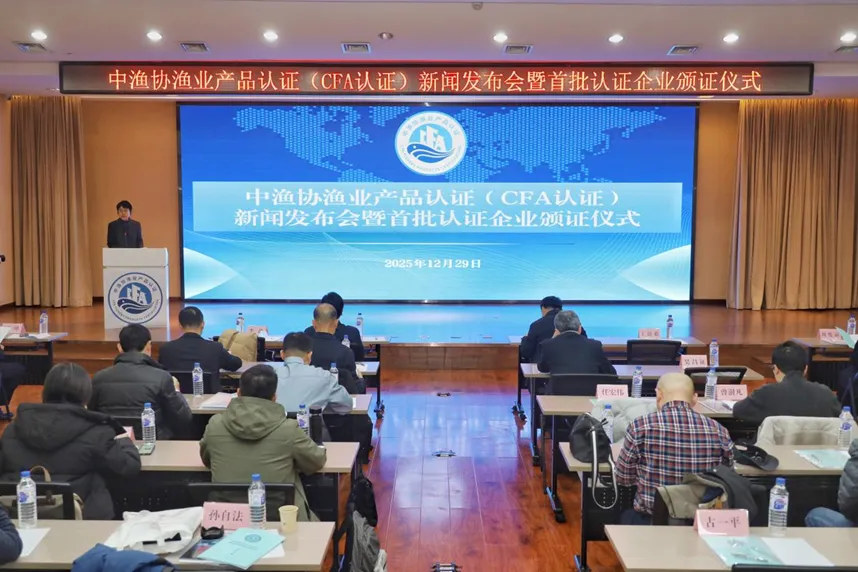 2025年12月29日下午,“中渔协渔业产品认证(CFA认证)”新闻发布会暨首批认证企业颁证仪式在北京中欧宾馆举行。本次活动由中国渔业协会与北京华思联认证中心共同主办,以“树立行业品质标杆,赋能产业绿色升级”为宗旨,正式推出具有中国特色的渔业产品认证体系,标志着我国渔业标准化与质量安全保障工作迈出关键一步。