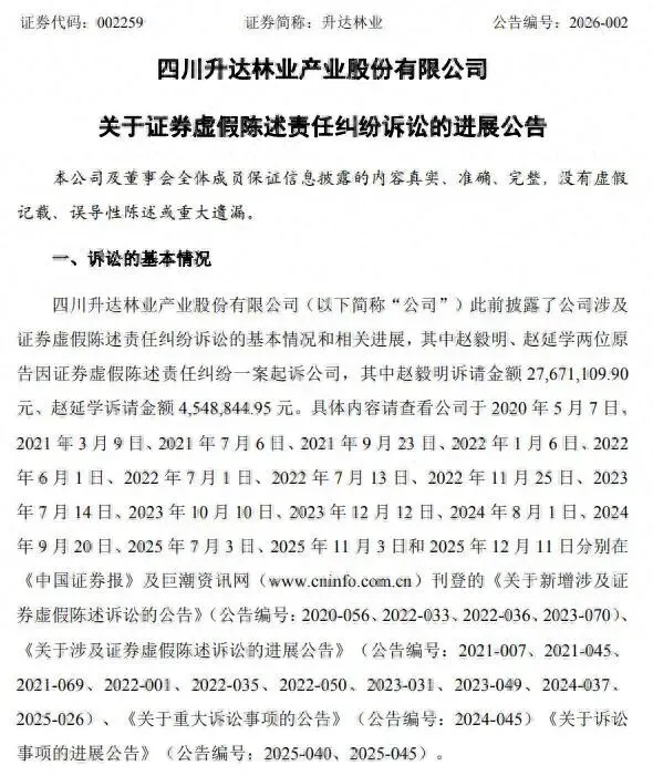 此前,升达林业披露了公司涉及证券虚假陈述责任纠纷诉讼的基本情况和相关进展,其中赵毅明、赵延学两位原告因证券虚假陈述责任纠纷一案起诉公司,其中赵毅明诉请金额27,671,109.90元、赵延学诉请金额4,548,844.95元。