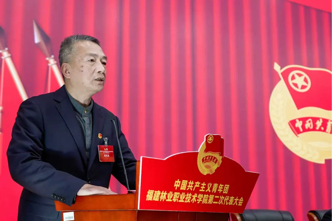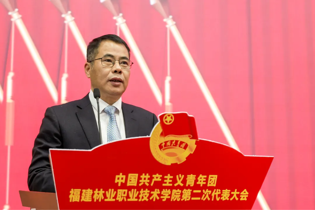 陈建辉代表学院党委向大会的召开表示祝贺,向长期以来关心支持学院发展的上级团组织、兄弟高校及社会各界朋友表示感谢,对学院共青团工作给予肯定。他表示,学院各级团组织是学院党委能够完全信赖,关键时刻靠得住、顶得上的先锋力量,是服务学院发展和青年成长的坚强堡垒。林职青年是胸怀理想、堪当重任、充满朝气的一代,是学院“双高”建设的生力军、突击队。他向全院各级团组织和广大团员青年提出三点希望:一是坚守政治本色,在强化思想引领中把稳青春航向;二是聚焦主责主业,在服务人才培养中贡献青春力量;三是勇担时代使命,在投身绿色发展中书写青春华章。他表示,学院党委将一如既往加强对共青团工作的全面领导,希望全院各级党组织、各部门关心青年、支持青年,为青年成长成才创造更优环境。