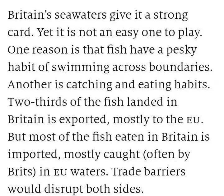 Two-thirds of the fish landed in Britain is exported, mostly to the EU. But most of the fish eaten in Britain is imported, mostly caught (often by Brits) in EU waters. Trade barriers would disrupt both sides.