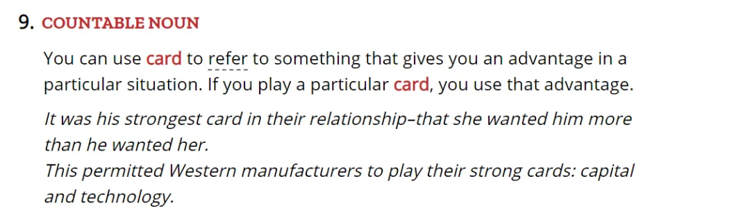 card字面意思是“纸牌”,这里引申为“优势,王牌”,以此衍生出来的词组也不少,比如hold all the cards(占极大优势),someone’s strongest/winning card(某人的王牌/某人制胜的绝招)。