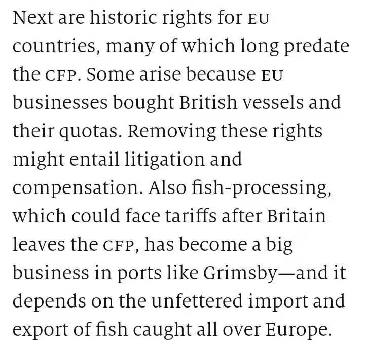 第三个原因是欧盟国家的历史权利,其中很多权利早于共同渔业政策的签署。一些权利的产生是因为欧盟企业购买了英国船只及其捕鱼配额。取消这些权利可能会牵涉到诉讼和赔偿。