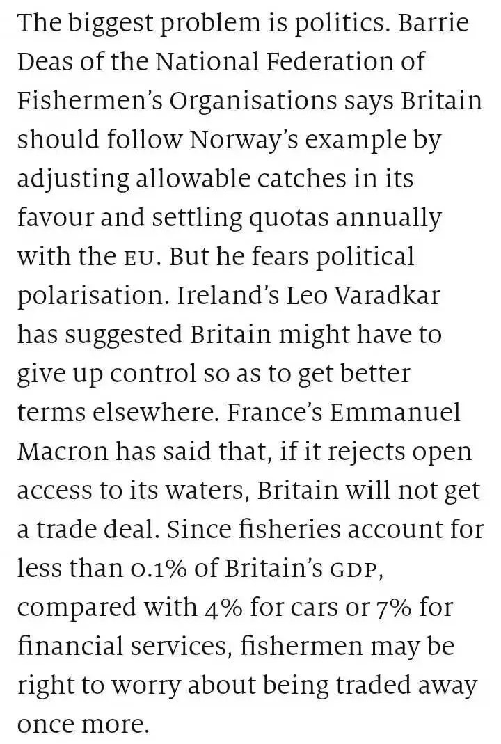 Since fisheries account for less than 0.1% of Britain’s GDP, compared with 4% for cars or 7% for financial services, fishermen may be right to worry about being traded away once more.