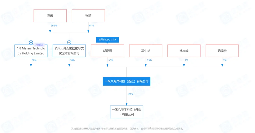 天眼查数据显示,7月20日,一米八海洋科技(浙江)有限公司成立。杭州大井头贰拾贰号文化艺术有限公司位居第二大股东,持股比例达10%。股权穿透发现,马云持有该公司99.9%的股份。
