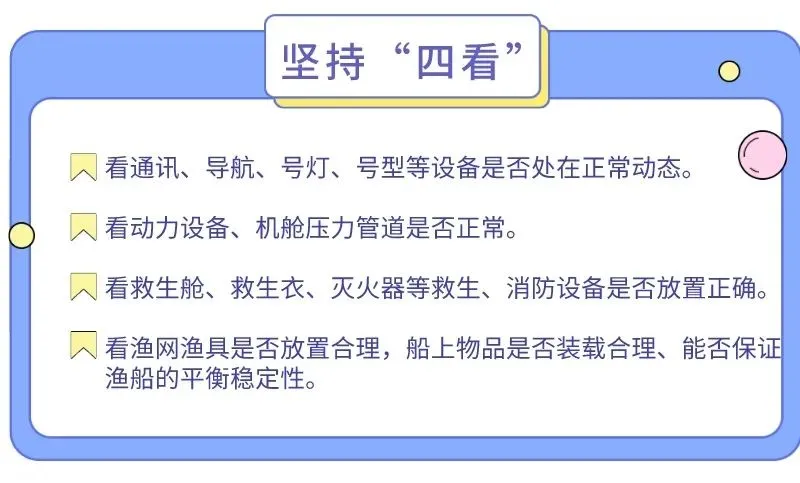 1、渔船在航行时必须有专人值班瞭望,不得擅离岗位,交接班应履行交接手续。
