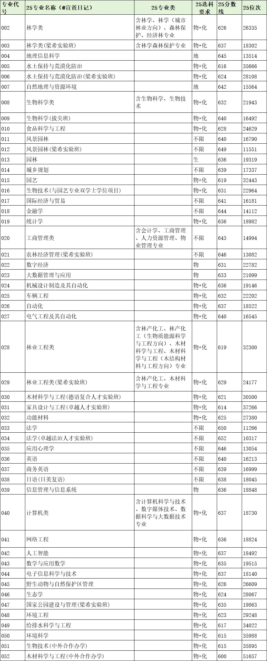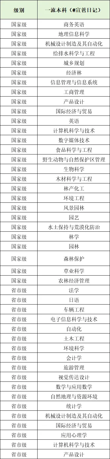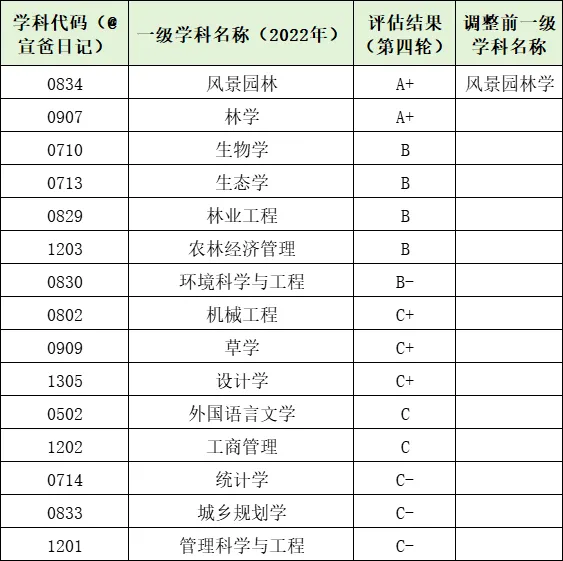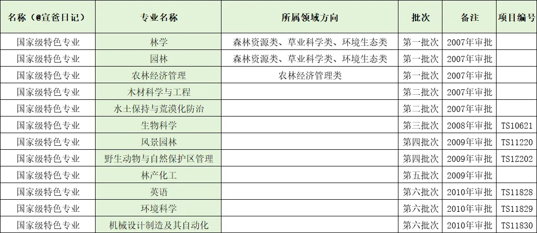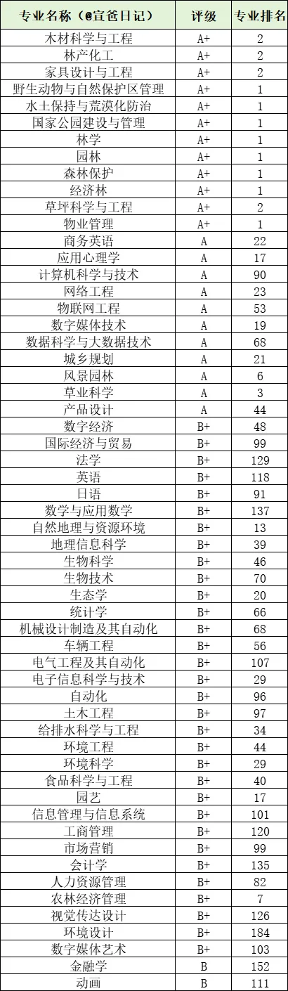 获批全国唯一“生态文明建设”国家教材建设重点研究基地,承建最高检首个在非政法类院校建立的检察公益诉讼研究基地,获批生物科学拔尖学生培养计划2.0基地1个、国家理科人才培养基地1个、国家级实验教学示范中心1个、国家级虚拟仿真实验教学示范中心等7个、国家级虚拟教研室建设试点5个、国家级一流本科专业建设点27个、国家级一流本科课程28门、国家级虚拟仿真实验教学一流课程5门、国家级课程思政示范课程2门、国家级课程思政教学名师和教学团队2支,获得国家级教学成果奖11项、全国优秀教材奖3项、全国教材建设先进个人1人、教育部战略性新兴领域“十四五”高等教育教材体系建设团队1支、全国普通高校大学生竞赛榜单内竞赛国家级一等奖及金奖41项、中国国际大学生创新大赛等国家级奖项5项、全国优秀博士论文12篇。近年来,毕业生毕业去向落实率保持在94%以上,其中到林草行业、西部地区、基层一线就业比例近20%,生态文明相关专业毕业生行业内就业比例超45%。