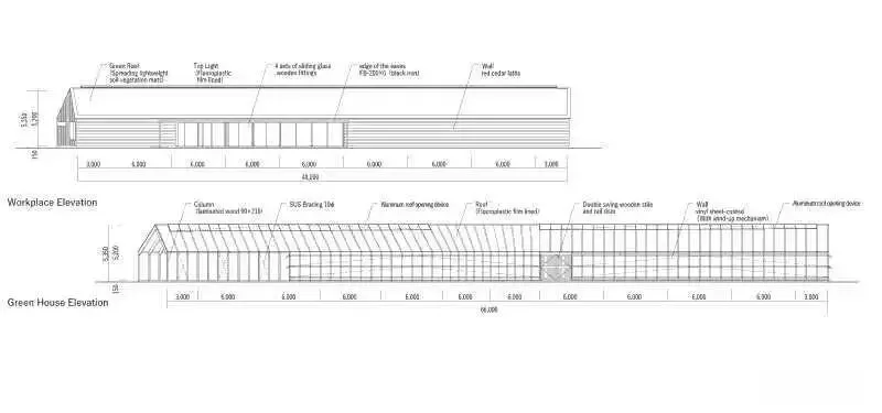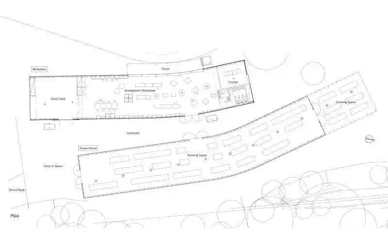 这座建筑的设计理念,是想营造出一种如同日本糕点般的质感,那种细致处理天然食材的感觉。该设施主要作为“Candy Farm / Taneya Agri-Culture”的基地,这个机构负责培育、整理和盆栽野花,用于全国各地的日式糕点店陈列,同时也进行农业研究、实践以及当地的景观管理。搬运和摆放盆栽野花的工作,很自然地让人联想到木结构工棚的景象。建筑的有机形态呈现为一道舒缓的弧线,以顺应被树木和缓坡土丘环绕的场地。