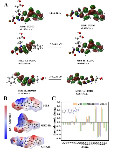 Figure 3. Computational chemistry parameters of MBZ, haptens MBZ-H1 and MBZ-H2 (A); distribution and gaps (ΔE) of the HOMO and LUMO for MBZ, haptens MBZ-H1 and MBZ-H2 (B); ESP surfaces of MBZ, haptens MBZ-H1 and MBZ-H2; (C) Mulliken charge distribution of MBZ, haptens MBZ-H1 and MBZ-H2. Only those atoms that are shared by these structures are displayed. Hydrogen atoms are not included.