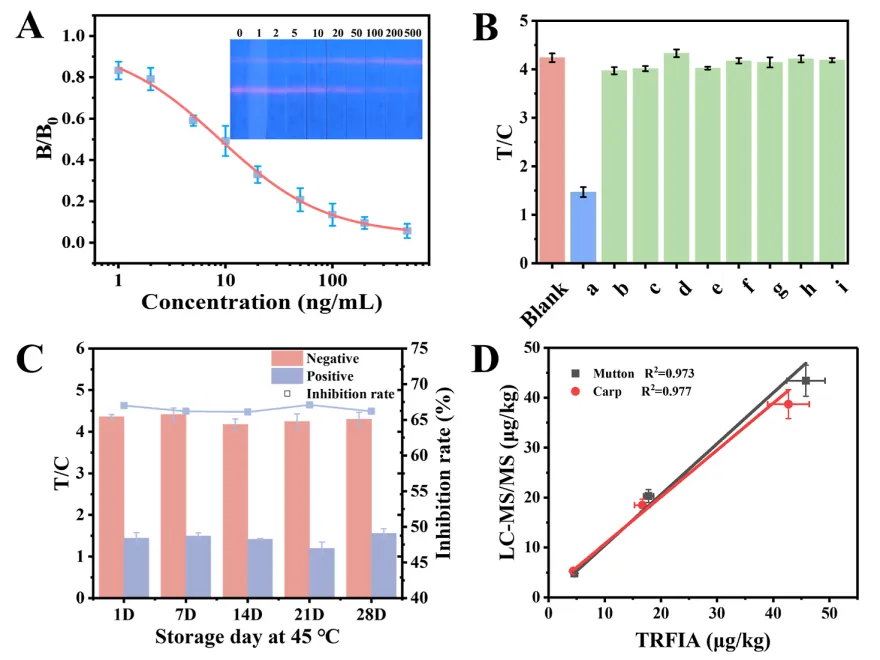 Figure 4. Characterization of the monoclonal antibody (mAb) and TRFM-mAb conjugate. (A) The subtype of the mAb (the inset picture is the prepared hybridoma cell lines under microscopy); (B) the ic-ELISA inhibition curve of the anti-MBZ mAb against MBZ; (C) TEM of TRFM; (D) Zeta potential of TRFM and TRFM-mAb.Figure 5. Performance of TRFIA. (A) The standard curve of MBZ detection by TRFIA, (B) the specificity of TRFIA for detection of MBZ. (a-i: Mebendazole; 2-amino-5-benzoyl-benzimidazole; 5-hydroxymebendazole; Albendazole; Albendazole; Sulfone; Albendazole sulfoxide; Oxfendazole; Flubendazole; Carbendazim); (C) the stability of TRFIA; (D) Comparison the results of LC/MS/MS with those of TRFIA.