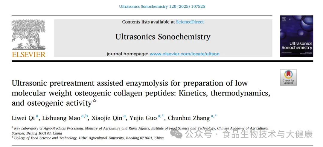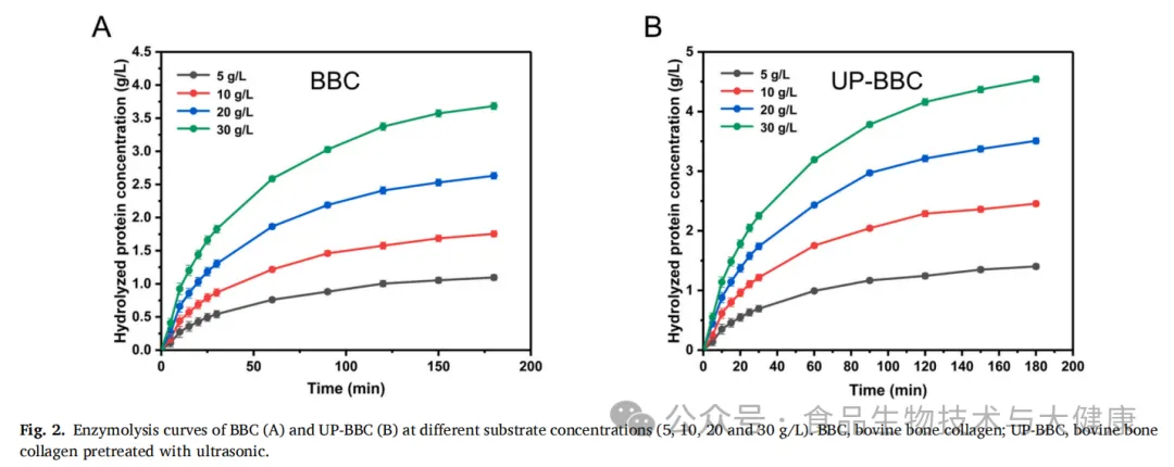超声波(US)预处理是食品工业中提高酶解效率的关键处理方法,主要是因为超声波可以展开蛋白质结构并暴露出更多的活性位点。此外,US的空化作用会产生机械和热效应,从而增强传质并增加底物和酶之间的接触频率。因此,US预处理已被广泛用于通过提高蛋白质转化率和酶水解率来增强生物活性肽的制备过程。然而,很少有研究评估了使用美国预处理辅助酶解从畜禽骨副产品中制备LMW成骨胶原肽的方法。
