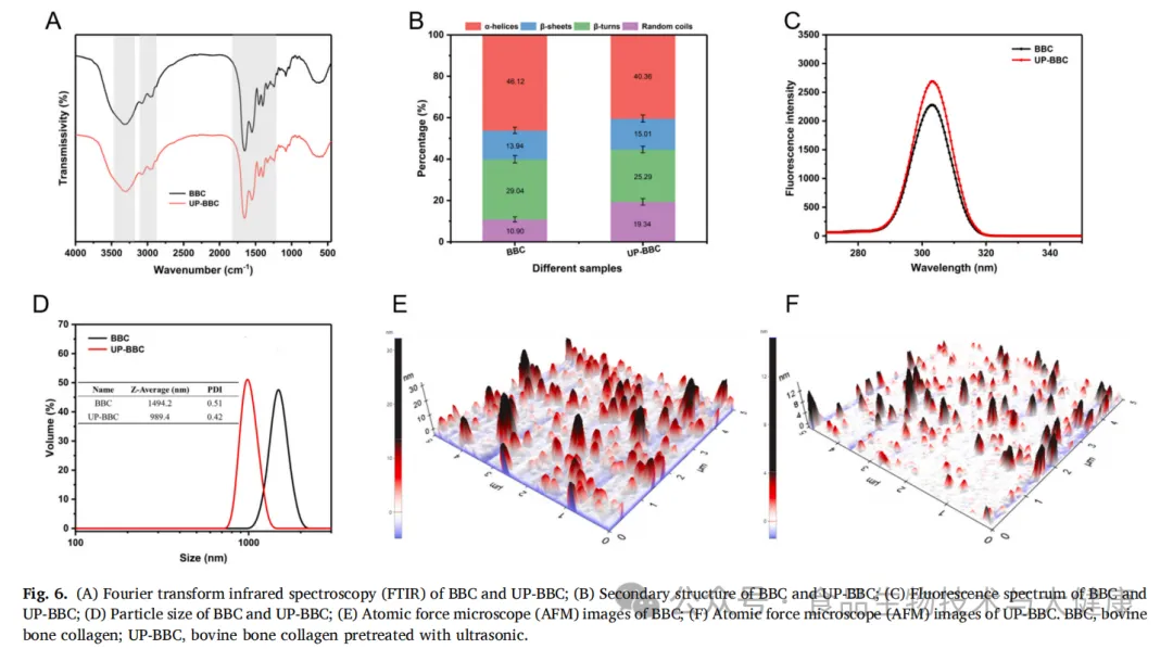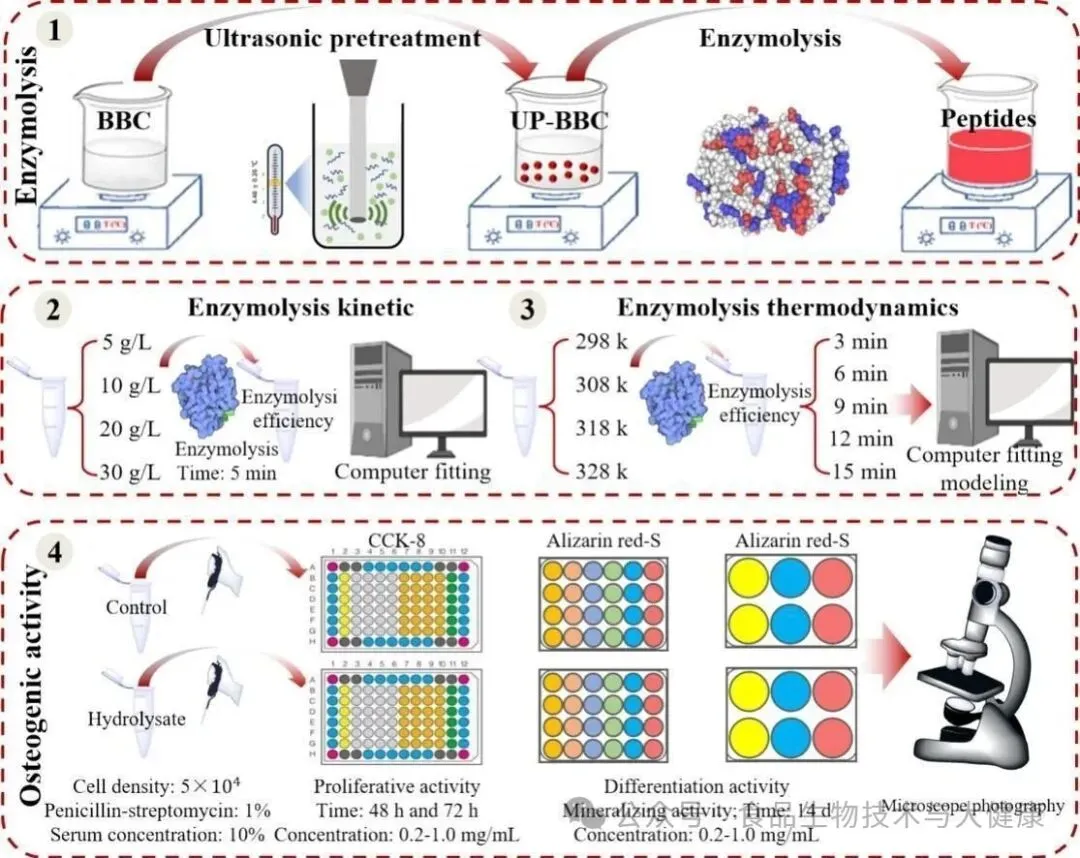 该研究测定了酶解动力学和热力学参数,分析了超声波预处理对酶解效率的积极影响。利用傅里叶变换红外光谱(FTIR)、荧光光谱和原子力显微镜(AFM)探索了US处理提高酶解效率的潜在机制。此外,使用高效液相色谱法(HPLC)测量了牛骨胶原(BBC)肽的分子量,并使用MC3T3-E1细胞实验评估了它们潜在的促成骨活性。该研究为US在畜禽骨副产品高价值加工利用中的应用提供了新的见解和理论基础。