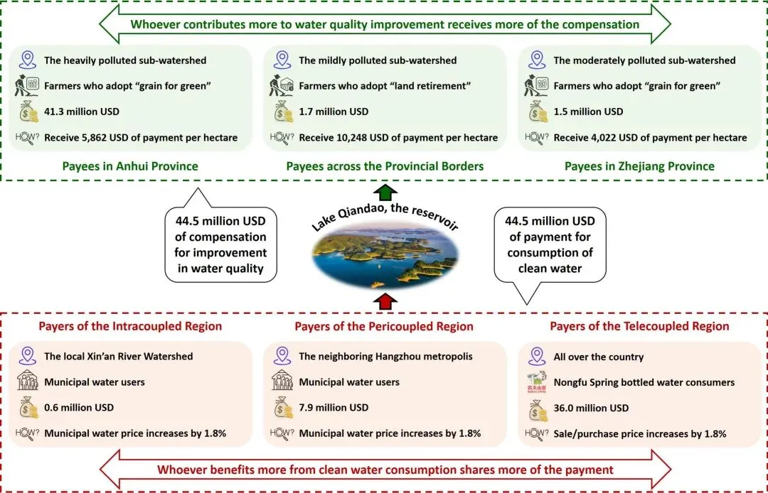 研究提出一套兼顾元耦合系统跨区域生态系统服务流动,且公平、可持续、可操作的PES方案。基于新安江流域的研究表明,成本效益与社会经济可行性是相辅相成的目标,可在不同组织层面实现。项目层面,高成本效益意味着以较低社会经济成本换取显著环境效益;个体层面,生态系统服务供给方(如目标农户)获得的补偿可覆盖其土地利用转型损失,而受益方(如用水户)需为享有的水质改善等环境效益付费。有效激励双方参与。